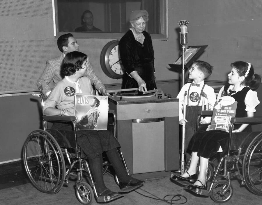 Eleanor Roosevelt playing Elvis Presley for polio-afflicted children in a broadcast aimed to benefit the pro-vaccine March of Dimes organization.